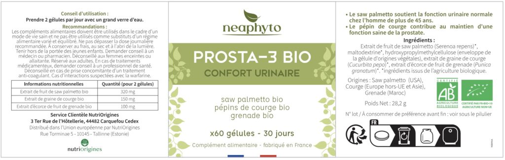Formulé par une équipe de nutritionnistes et d’experts en micro-nutrition, Prosta-3 Bio de Neaphyto contient des extraits de Saw palmetto, pépins de courge et grenade certifiés Bio.
