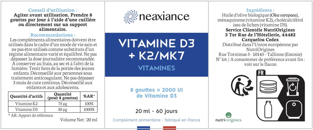 Formulé par une équipe de nutritionnistes et d’experts en micro-nutrition, Vitamine D3 + K2/MK7 de Neaxiance contient de la vitamine D3 et de la vitamine K2 sous forme MK7.
